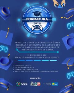 Cerimônia reúne alunos, especialistas e comunidade para marcar conclusão de curso tecnológico no Distrito Federal A cerimônia de formatura dos alunos do curso de Desenvolvimento de Games do projeto Reality Gamer DF será realizada no dia 21 de março, a partir das 13h, no Recanto Shopping, na Praça dos Espelhos. O evento marca a conclusão …