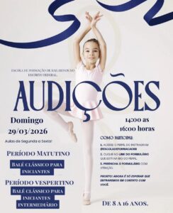As inscrições seguem abertas até sábado, dia 28 de março. A audição será realizada no domingo, dia 29 de março, das 13h30 às 16h, no Centro de Dança do DF.
